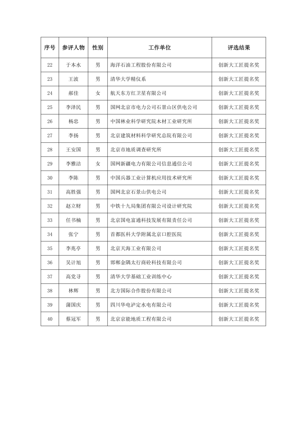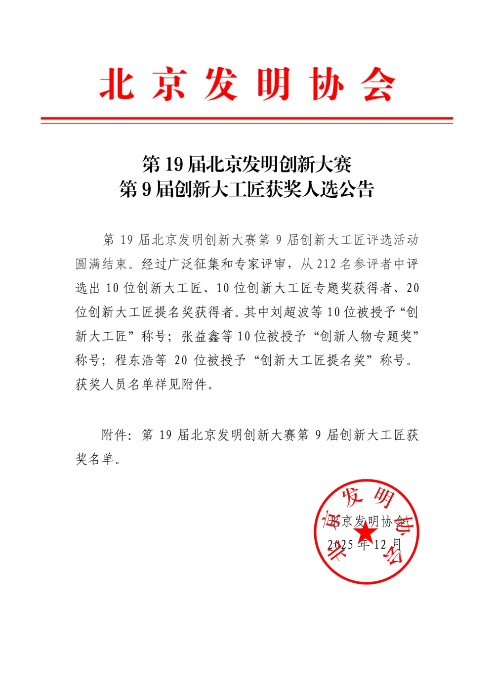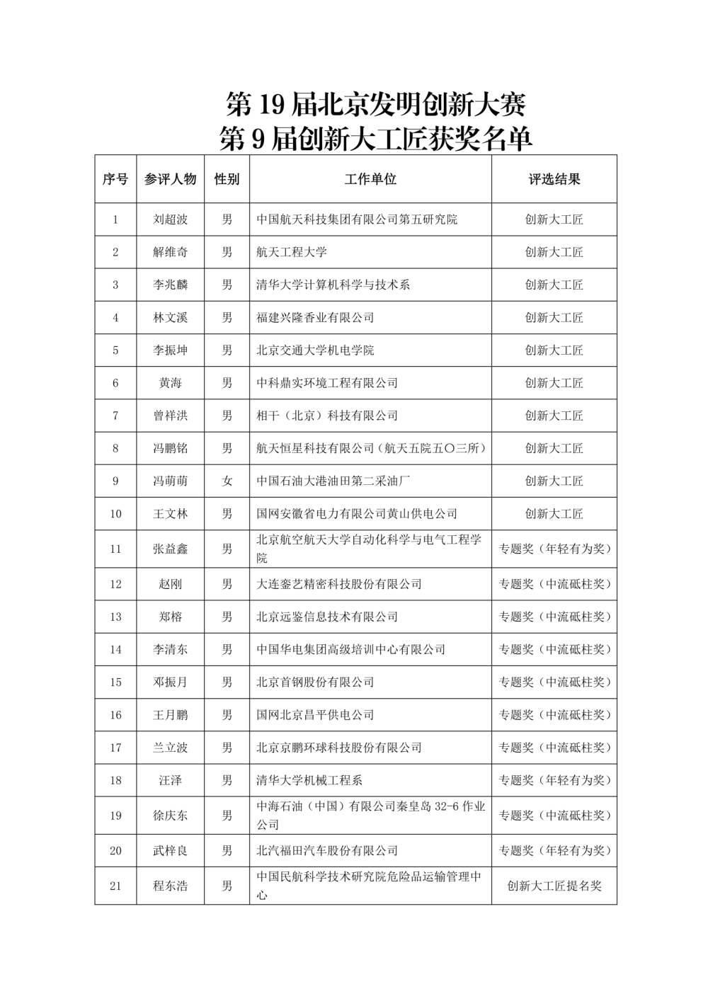 第19届北京发明创新大赛第9届创新大工匠获奖人选公告