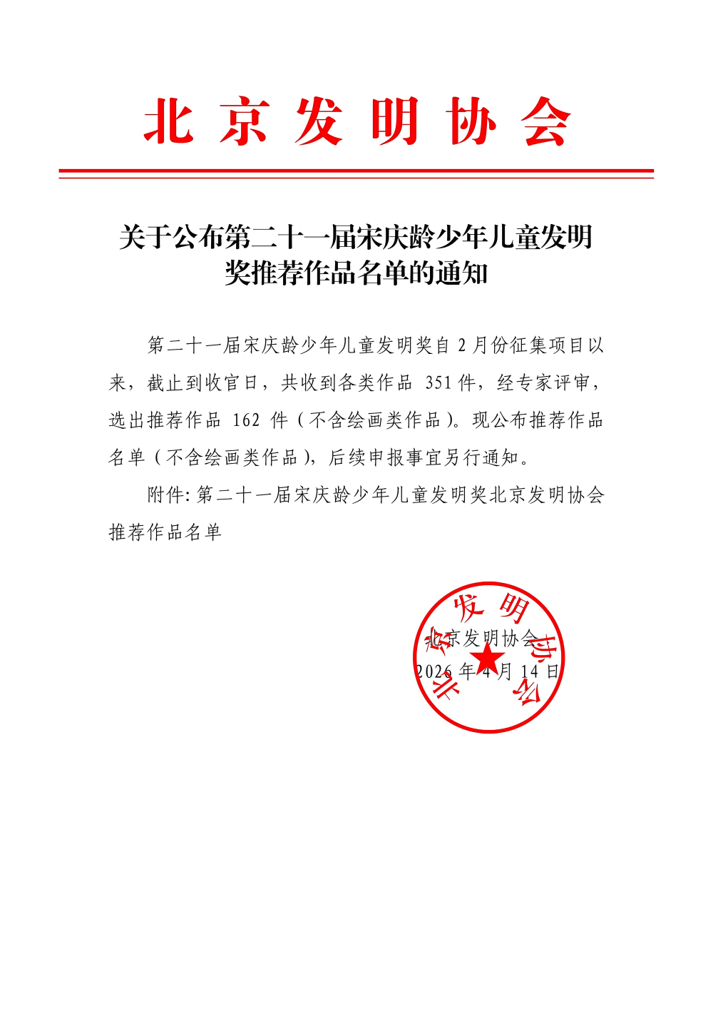 关于公布第二十一届宋庆龄少年儿童发明奖推荐作品名单的通知
