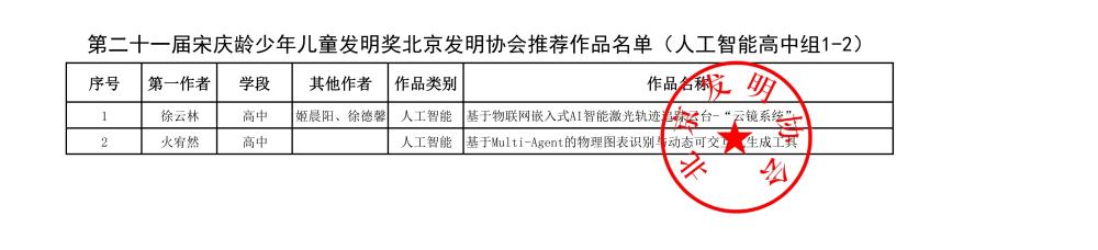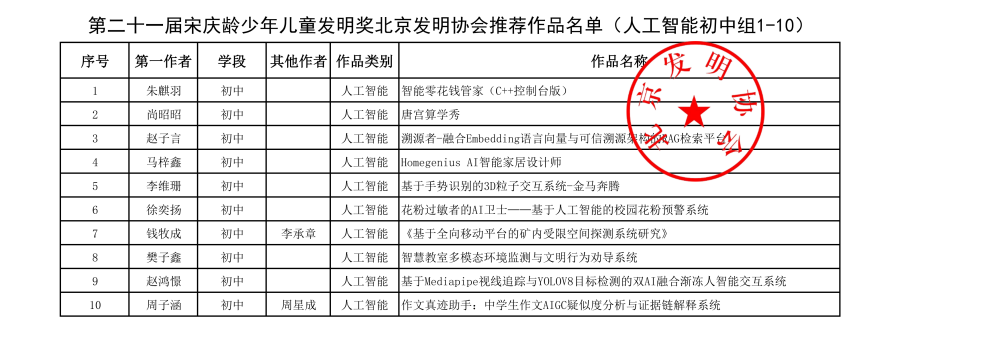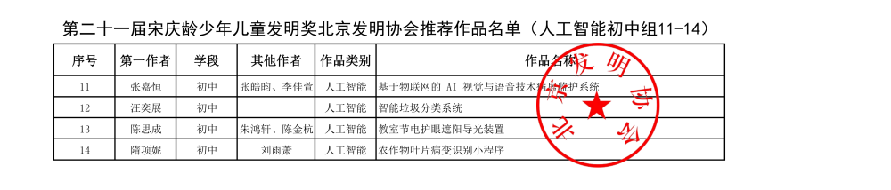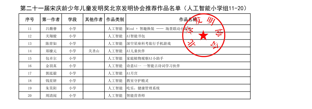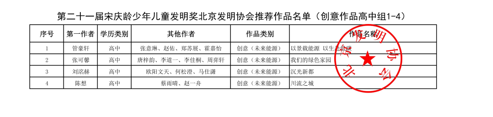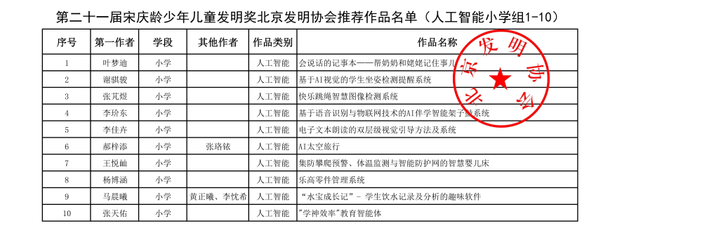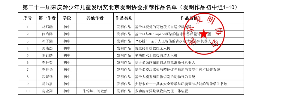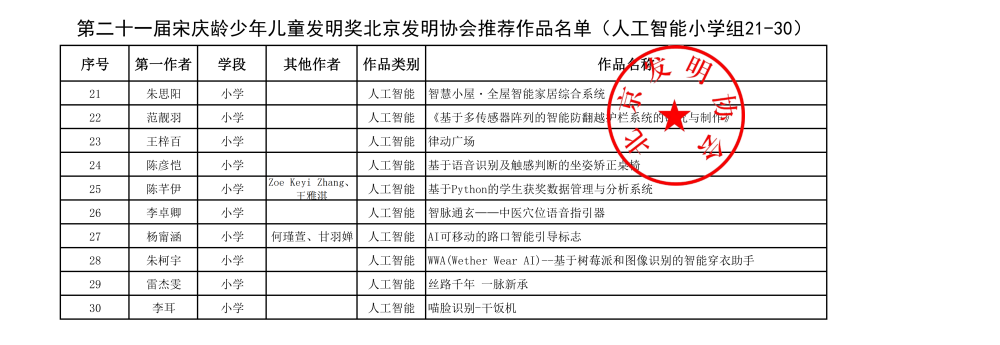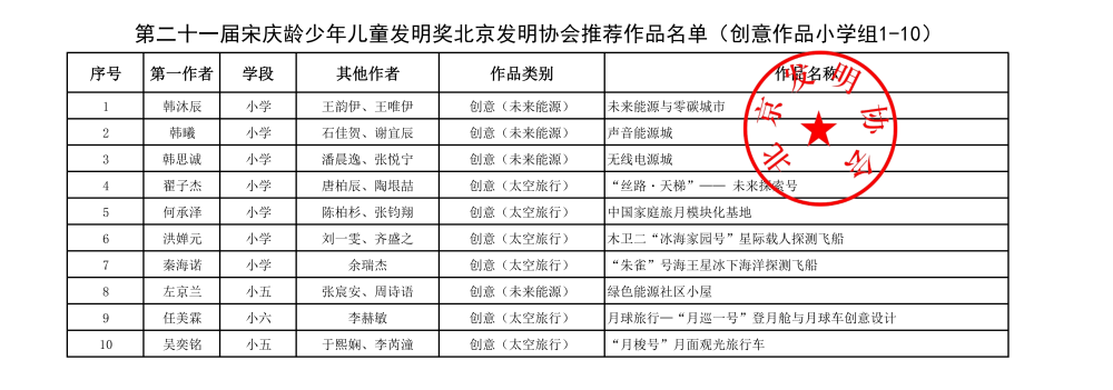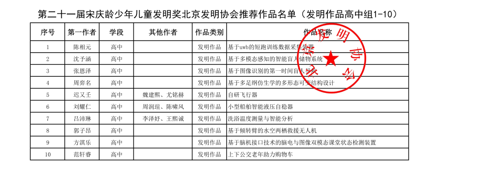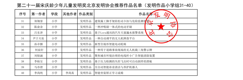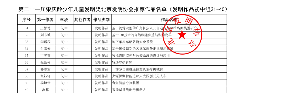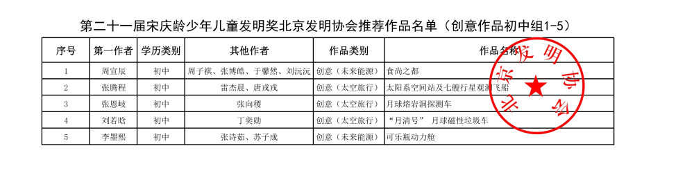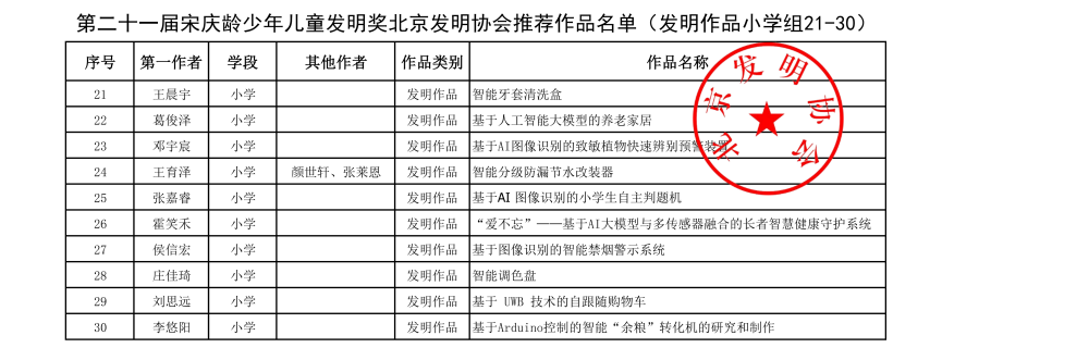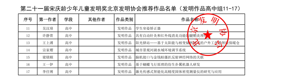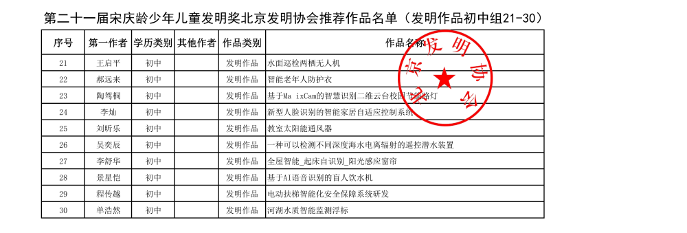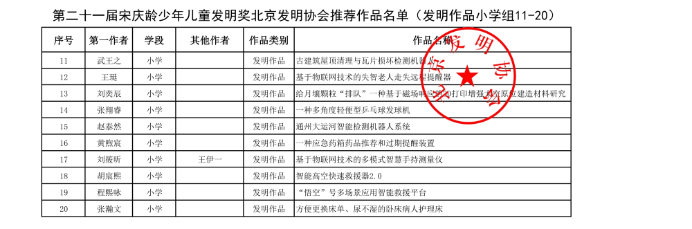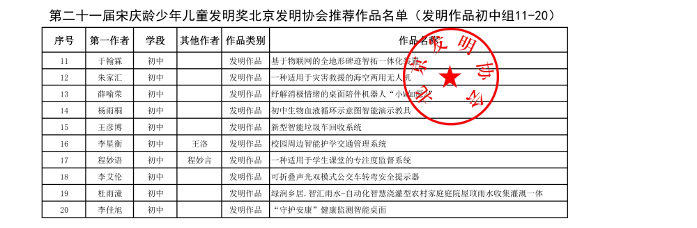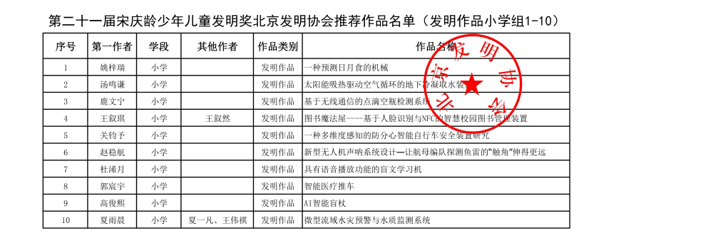 第二十一届宋庆龄少年儿童发明奖北京发明协会推荐作品名单